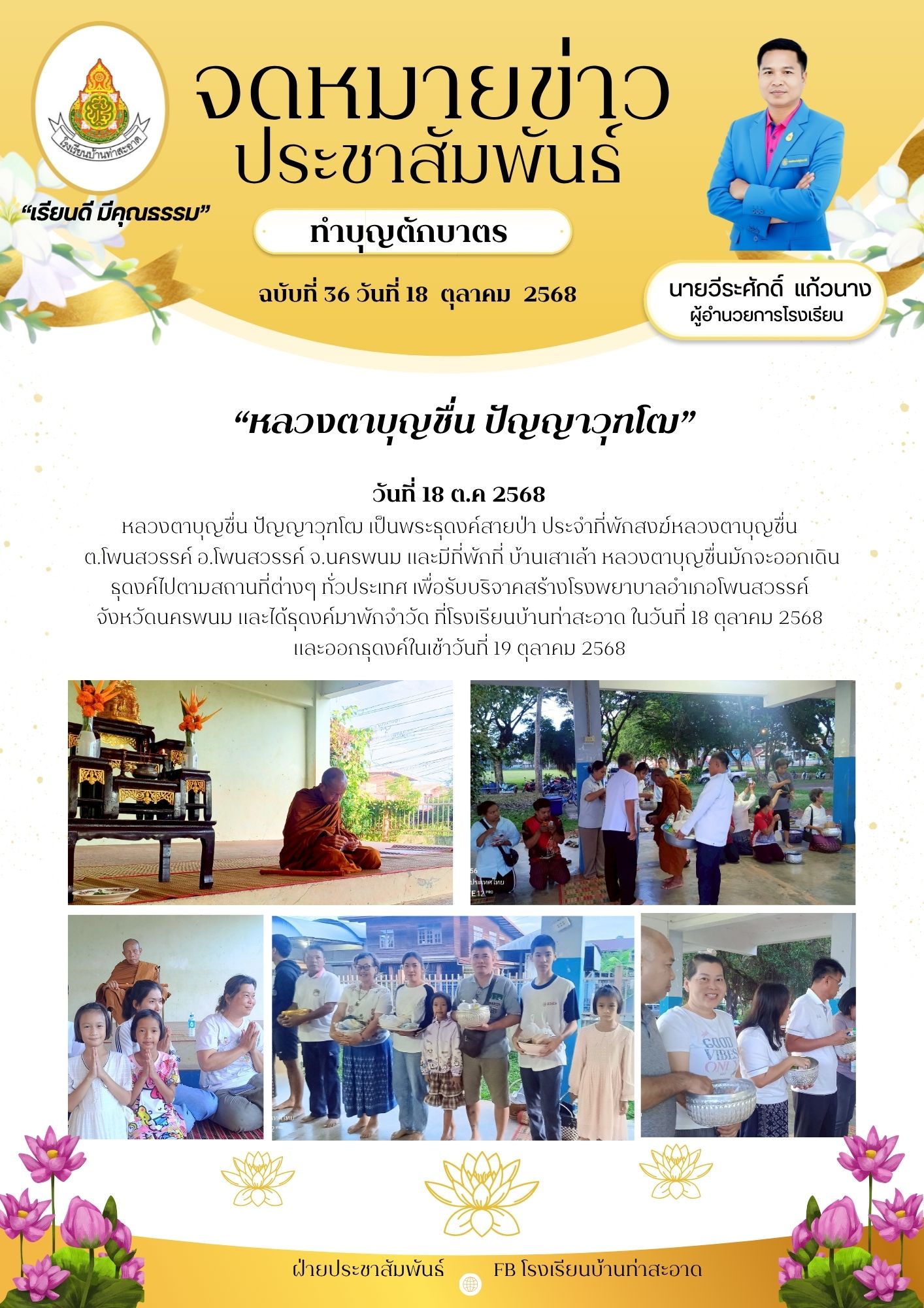 หลวงตาบุญชื่น ปัญญาวุฑโฒ ธุดงค์มาพักจำวัด ที่โรงเรียนบ้านท่าสะอาด ในวันที่ 18 ตุลาคม 2568 และออกธุดงค์ในเช้าวันที่ 19 ตุลาคม 2568 เพื่อรับบริจาคสร้างโรงพยาบาลอำเภอโพนสวรรค์ จังหวัดนครพนม