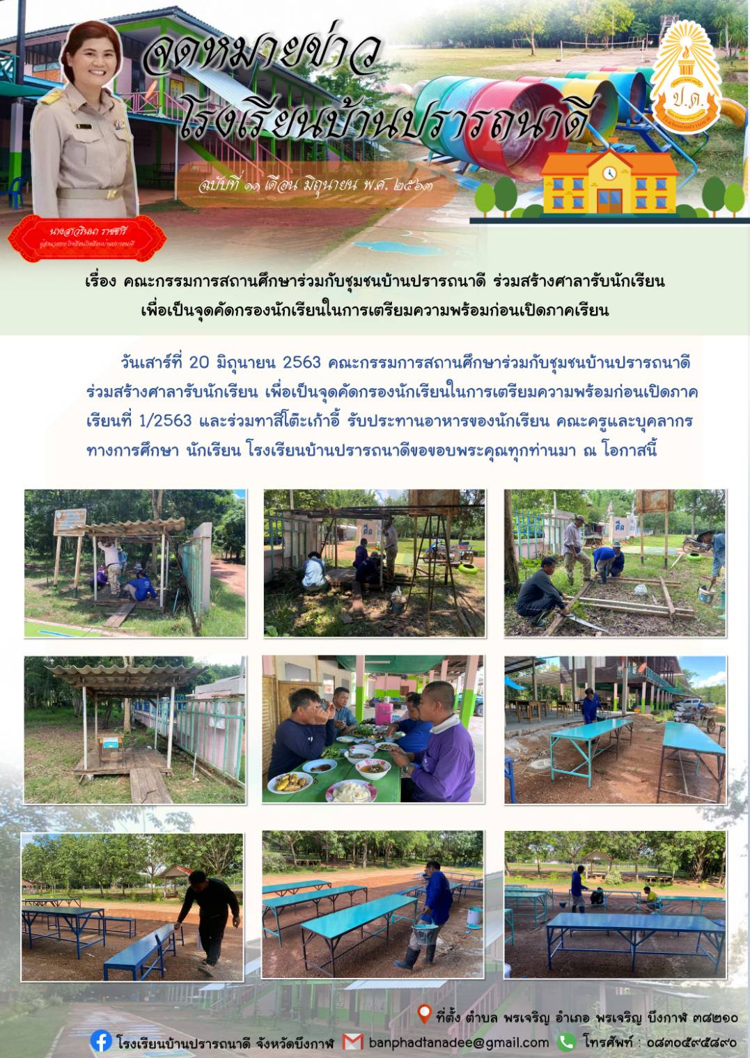 โรงเรียนบ่านปรารถนาดี ประชาสัมพันธ์ เรื่องคณะกรรมการสถานศึกษาร่วมกับชุมชนบ้านปรารถนาดี ร่วมสร้างศาลานักเรียนเพื่อเป็นจุดคัดกรองนักเรียนในการเตรียมความพร้อมก่อนเปิดภาคเรียน ที่ 1