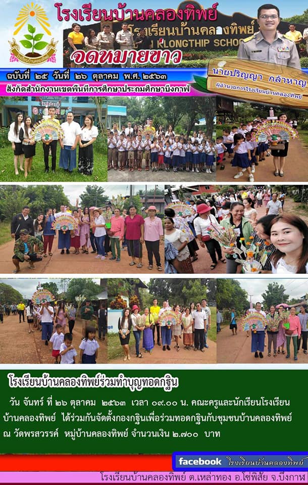 ![]() | บุญกฐิน 26 ตุลาคม 2563(เผยแพร่เมื่อวันที่ 12 พย 2563 13:09:57 น.) ผู้รายงาน : ธุรการโรงเรียน บ้านคลองทิพย์ |