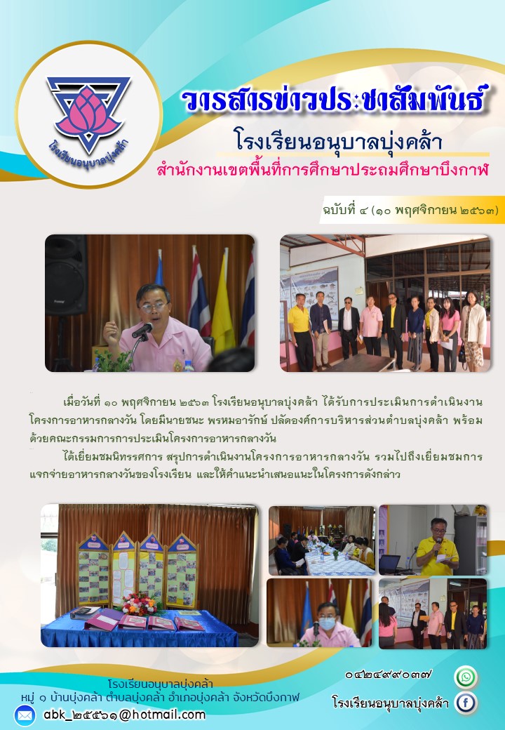 วันที่ ๑๐ พฤศจิกายน ๒๕๖๓ โรงเรียนอนุบาลบุ่งคล้า ได้รับการประเมินโครงการอาหารกลางวัน จากองค์การบริหารส่วนตำบลบุ่งคล้า คณะกรรมการสถานศึกษาขั้นพื้นฐานและตัวแทนผู้ปกครองนักเรียนโรงเรียนอนุบาลบุ่งคล้า