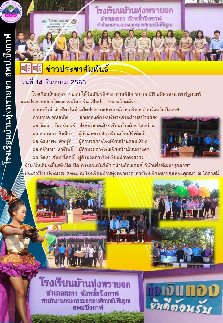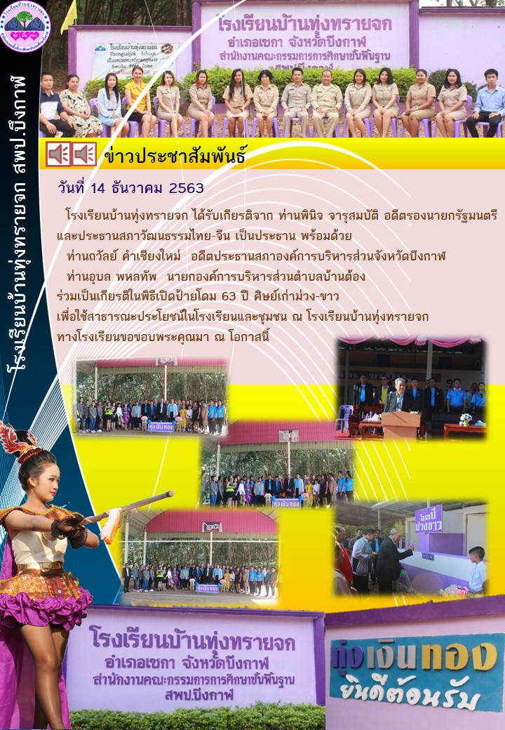 ![]() | พิธีเปิดป้ายโดม 63 ปี ศิษย์เก่าม่วง-ขาว (โรงเรียนบ้านทุ่งทรายจก)(เผยแพร่เมื่อวันที่ 17 ธค 2563 14:35:19 น.) ผู้รายงาน : ธุรการโรงเรียน บ้านทุ่งทรายจก |
