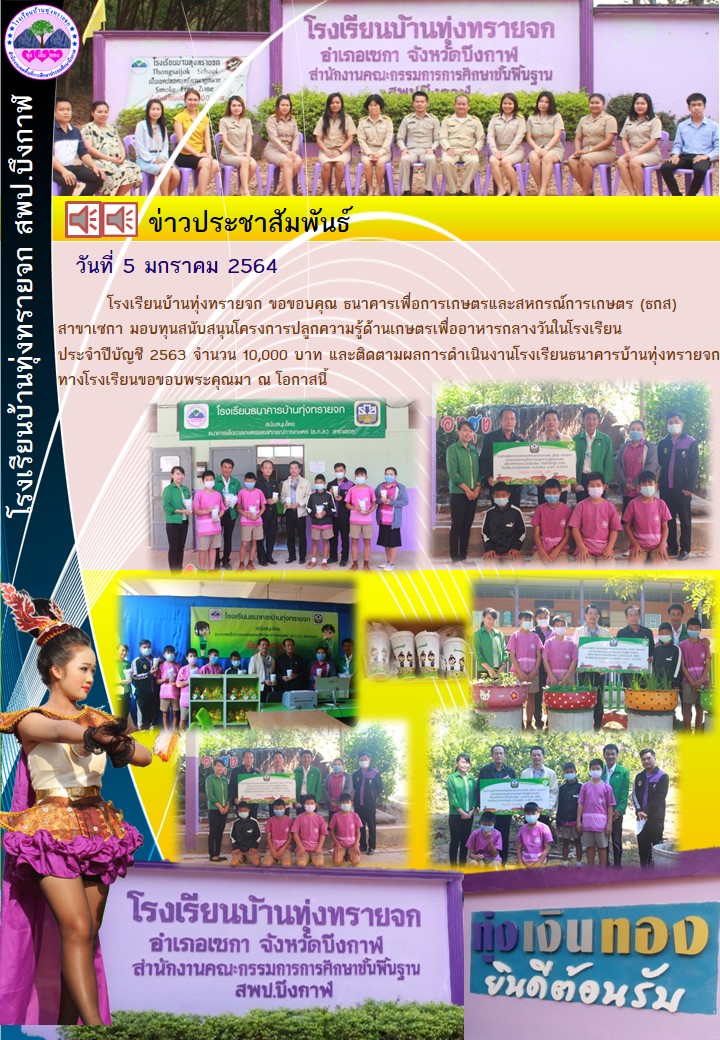 ธกส. สาขาเซกา มอบทุนสนับสนุนโครงการเกษตรเพื่ออาหารกลางวันและติดตามโครงการโรงเรียนธนาคาร (โรงเรียนบ้านทุ่งทรายจก)