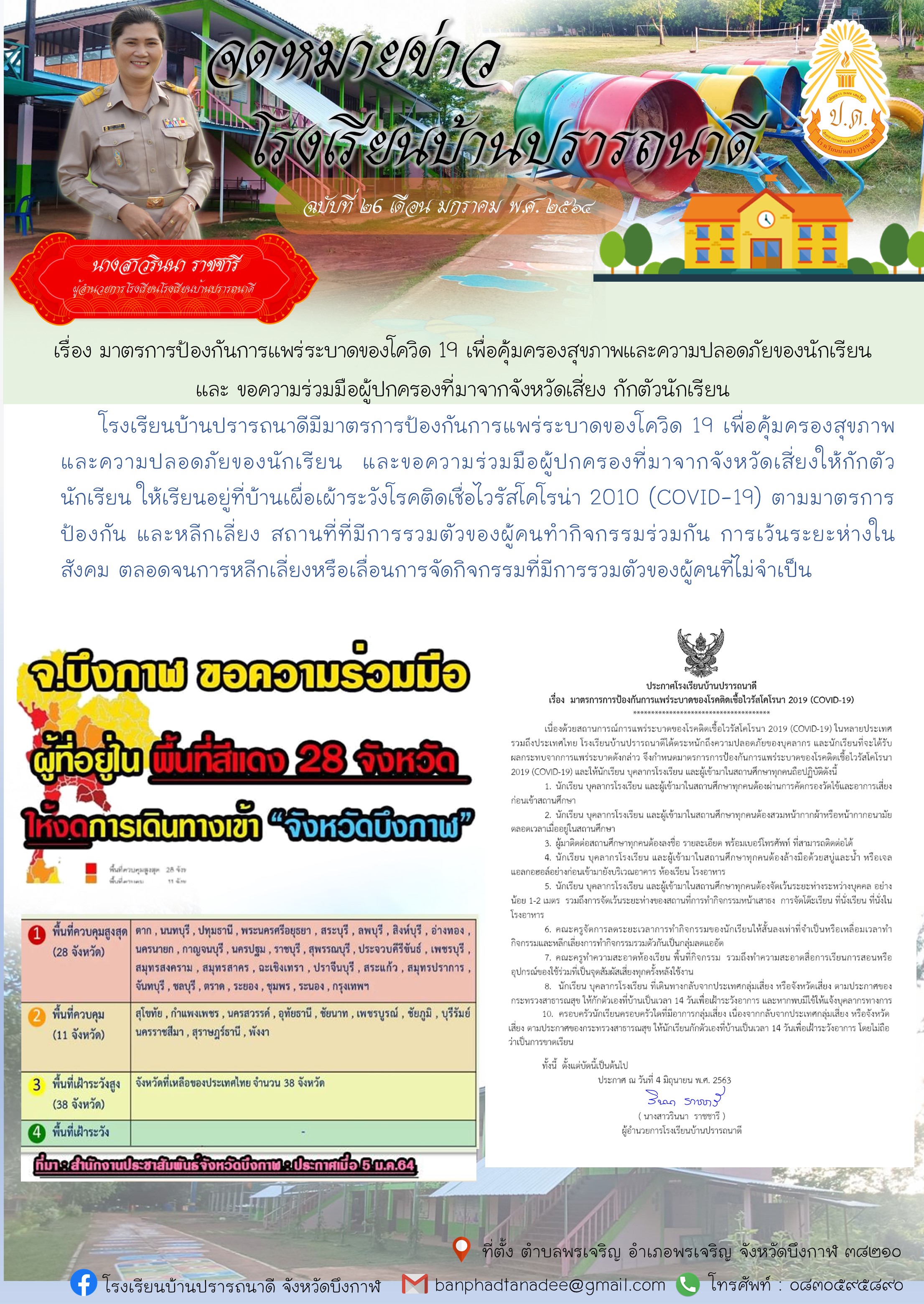 โรงเรียนบ้านปรารถนาดี ประชาสัมพันธ์มาตรการป้องกันการแพร่ระบาดโควิด 19 เพื่อคุ้มครองสุขภาพและความปลอดภัยของนักเรียนและขอความร่วมมือผู้ปกครองที่มาจากจังหวัดเสี่ยงกักตัวนักเรียน