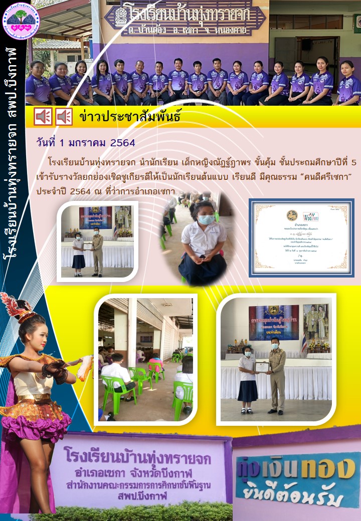 ![]() | โรงเรียนบ้านทุ่งทรายจก-นำนักเรียนเข้ารับรางวัลยกย่องเชิดชูเกียรติเป็นนักเรียนต้นแบบ เรียนดี มีคุณธรรม "คนดีศรีเซกา"(เผยแพร่เมื่อวันที่ 4 กพ 2564 13:41:06 น.) ผู้รายงาน : ธุรการโรงเรียน บ้านทุ่งทรายจก |