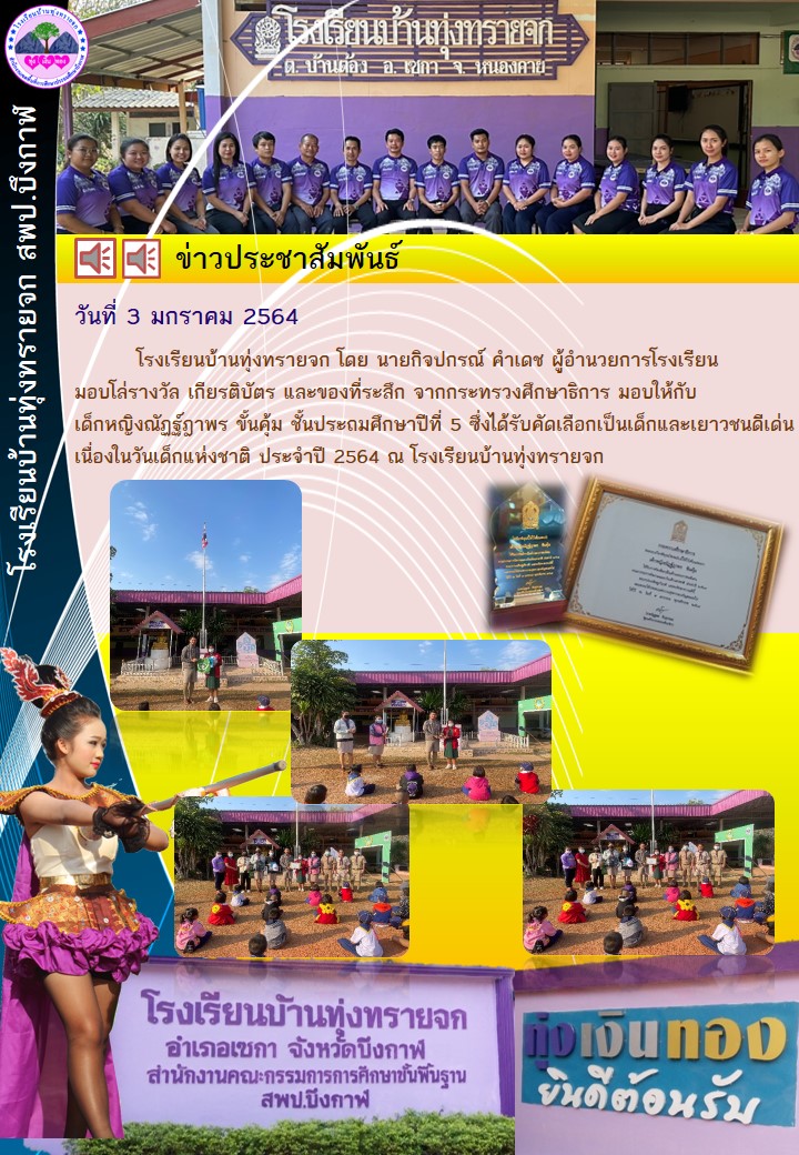 โรงเรียนบ้านทุ่งทรายจก-มอบโล่ รางวัล "เด็กและเยาวชนดีเด่น" เนื่องในวันเด็กแห่งชาติ ประจำปี 2564 จากกระทรวศึกาาธิการ