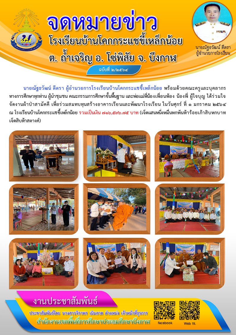 โรงเรียนบ้านโคกกระแชขี้เหล็กน้อย ได้จัดงานผ้าป่าสามัคคี เพื่อร่วมสมทบทุนสร้างอาคารเรียนและพัฒนาโรงเรียน ในวันศุกร์ ที่ ๑ มกราคม ๒๕๖๔