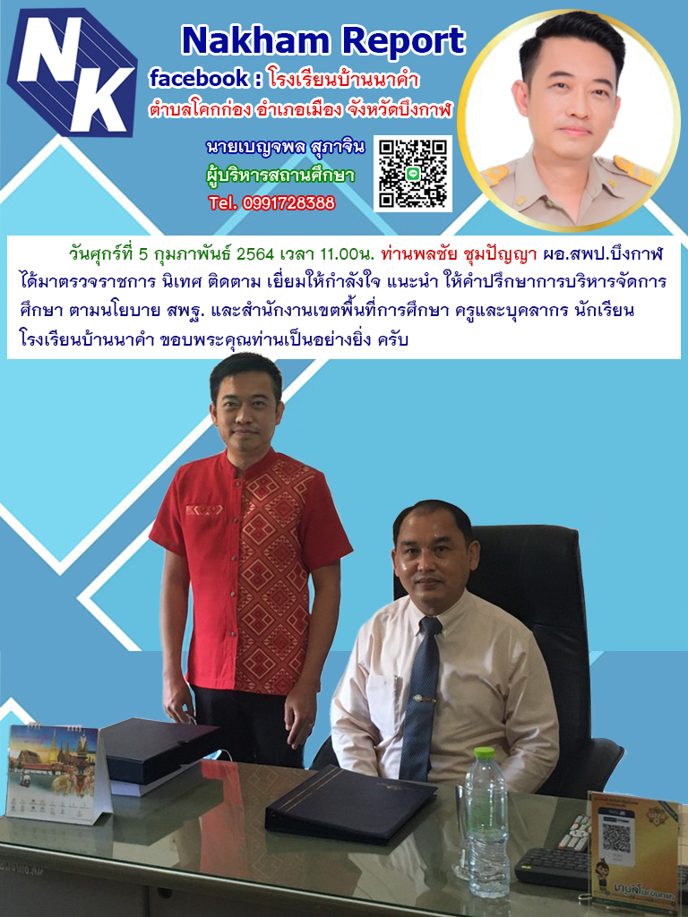 นายเบญจพล สุภาจิน ผู้อำนวยการโรงเรียนบ้านนาคำ ให้การต้อนรับนายพลชัย ชุมปัญญา ผู้อำนวยการสำนักงานเขตพื้นที่การศึกษาประถมศึกษาบึงกาฬ ได้ออกตรวจราชการในวันที่ ๕ กุมภาพันธ์ ๒๕๖๔ ณ โรงเรียนบ้านนาคำ กลุ่มโรงเรียนโคกก่องชัยพร