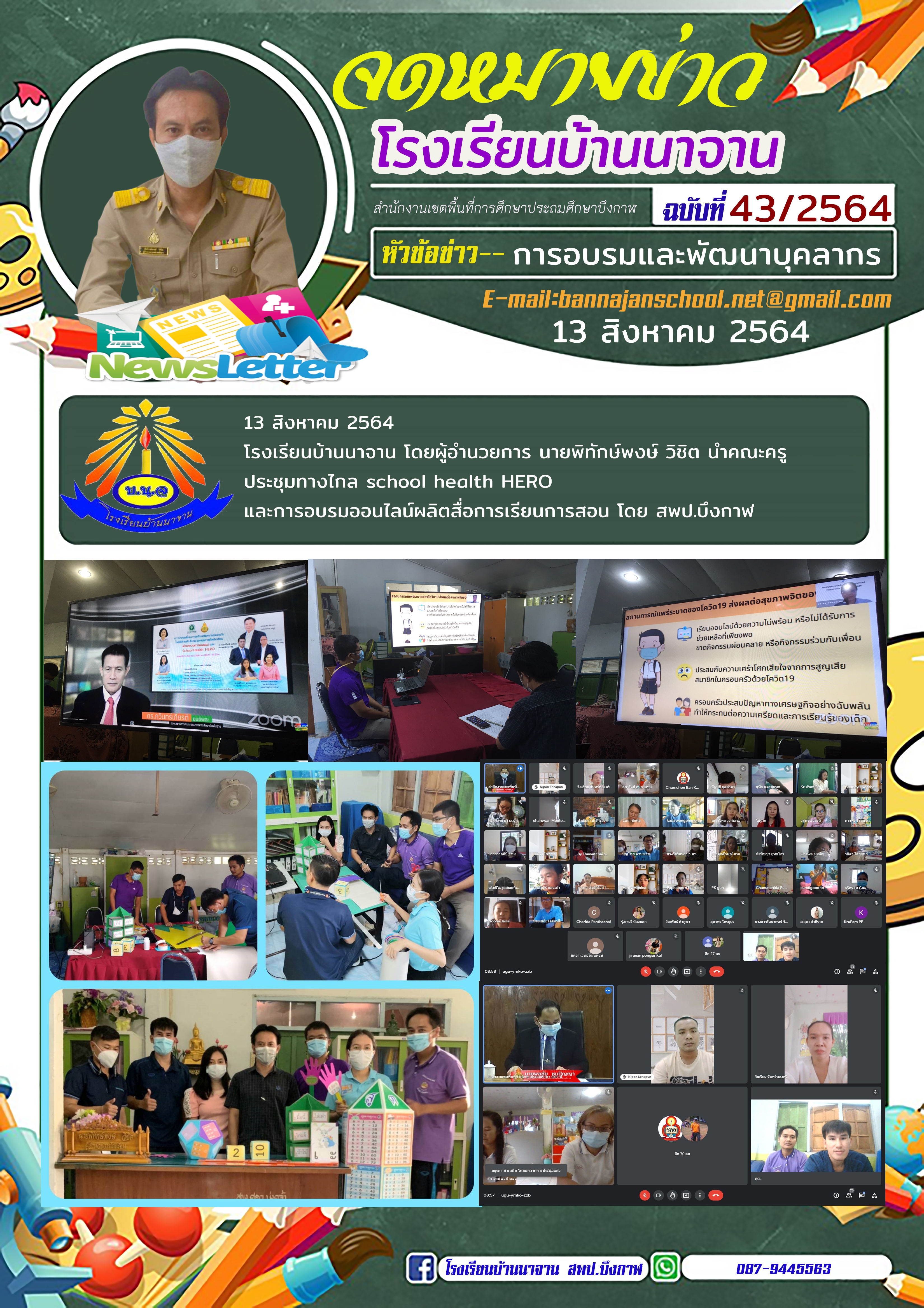 วันที่ 13 สิงหาคม 2564 โรงเรียนบ้านนาจาน โดยผู้อำนวยการ นายพิทักษ์พงษ์ วิชิต นำคณะครู ประชุมทางไกล school health HERO และการอบรมออนไลน์ผลิตสื่อการเรียนการสอน โดย สพป.บึงกาฬ