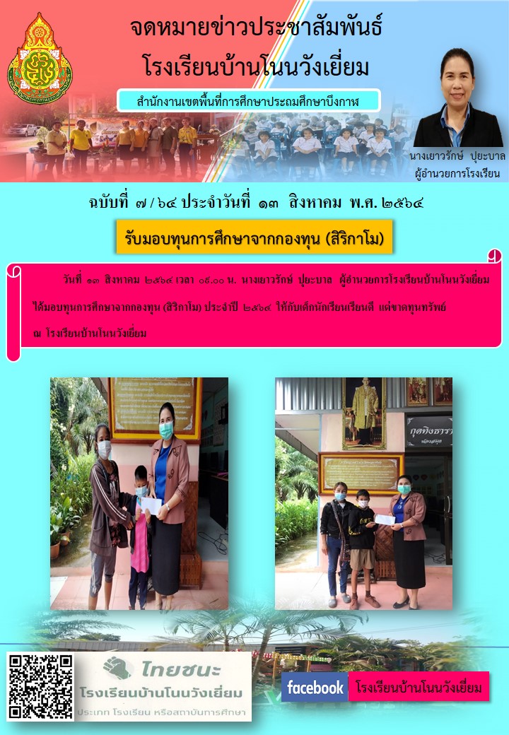 จดหมายข่าว โรงเรียนบ้านโนนวังเยี่ยม เรื่องการรับมอบทุนการศึกษาจากกองทุน (สิริกาโม)