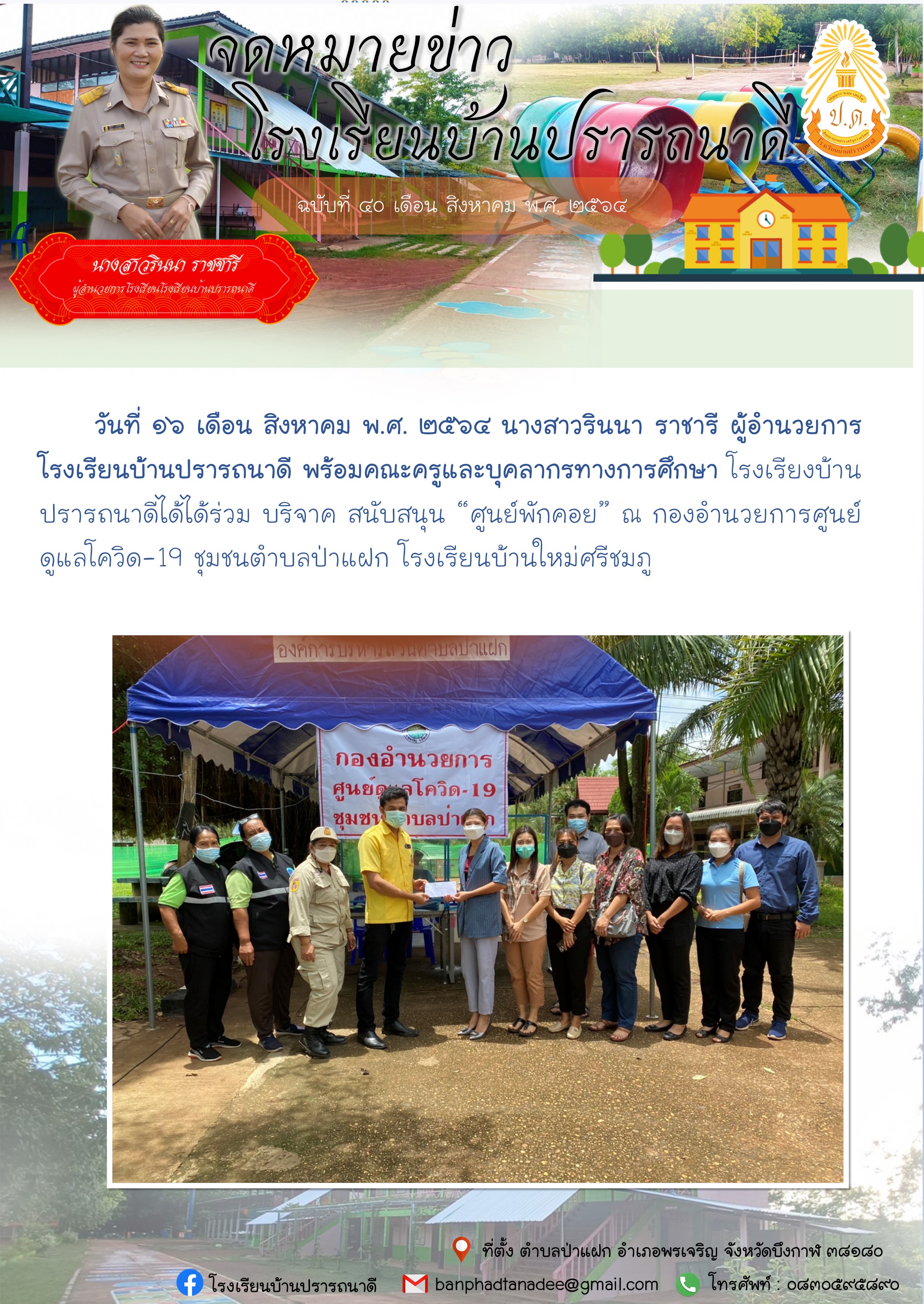 จดหมายข่าว โรงเรียนบ้านปรารถนาดี เรื่อง โรงเรียงบ้านปรารถนาดีได้ได้ร่วม บริจาค สนับสนุน “ศูนย์พักคอย” ชุมชนตำบลป่าแฝก