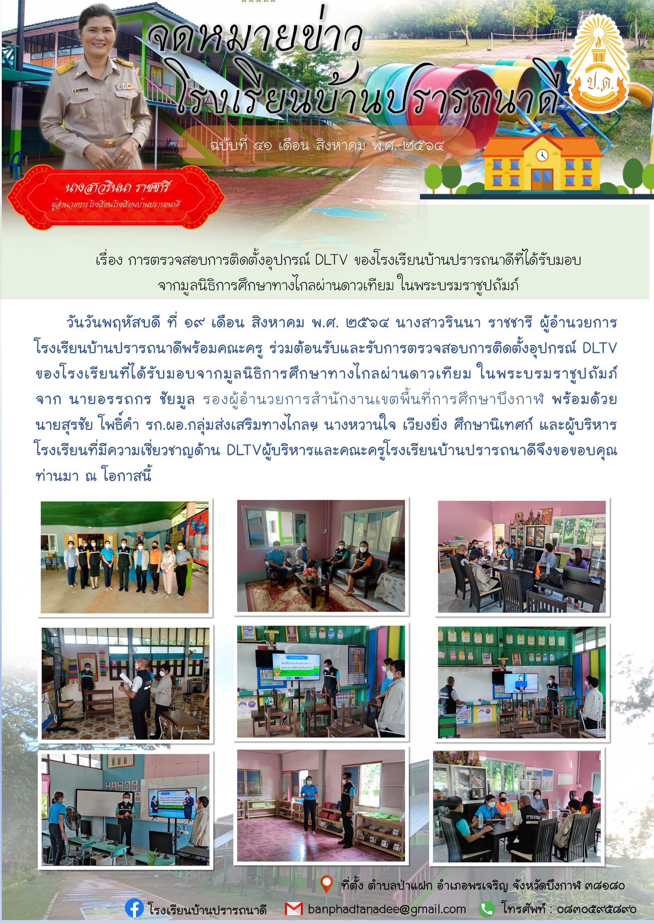 จดหมายข่าว โรงเรียนบ้านปรารถนาดี เรื่อง การตรวจสอบการติดตั้งอุปกรณ์ DLTV ของโรงเรียนบ้านปรารถนาดีที่ได้รับมอบจากมูลนิธิการศึกษาทางไกลผ่านดาวเทียม ในพระบรมราชูปถัมภ์