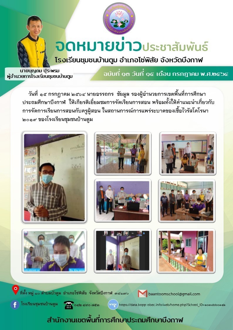 โรงเรียนชุมชนบ้านตูมได้รับการตรวจเยี่ยมจาก นายอรรถกร ชัยมูล รองผู้อำนวยการเขตพื้นที่การศึกษาประถมศึกษาบึงกาฬ ให้เกียรติเยี่ยมชมการจัดเรียนการสอน